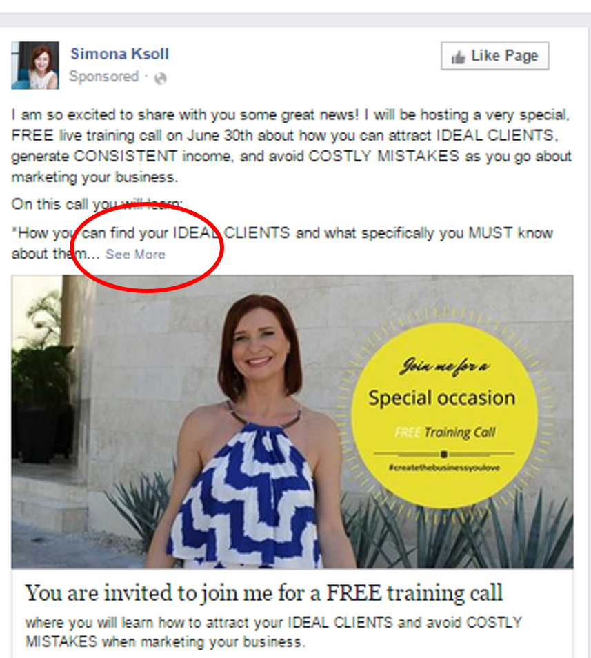 But here is the thing. Studies have shown that people now make a decision in just 3 seconds if they stay on your page/post or click over. That means your copy points that are visible before the “SEE MORE” section have to be
